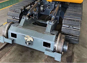 安裝鐵路導向輪,履帶板采用橡膠板,能實現(xiàn)在鐵路線路上自由上下道,并確保在鋼軌上行走而不會損傷鋼軌。